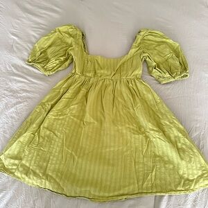 Charming lime green mini dress with puff sleeves. Ideal for casual wear. Stylish and comfy.