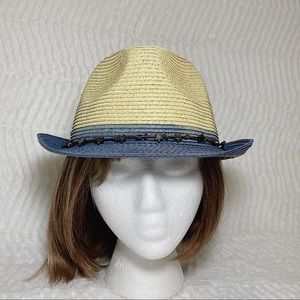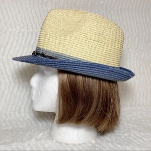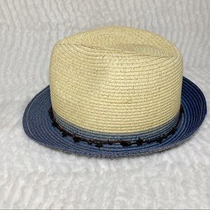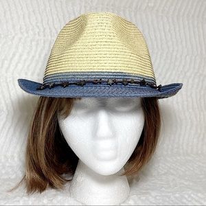 San Diego Hat Company straw fedora in natural with blue brim and metal star cord band. Women’s one size. Blue sweat band inside with adjustable ties. Meas approx: Brim 1-3/4”, Height 4”, inside 22”/adjustable, outside 32”. Condition: Excellent condition. Pet free and smoke free environment.
