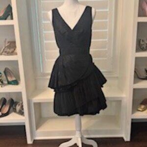 Chic + Timeless! This little black dress features a flattering V-neckline, fitted waist, and a striking tiered pleated skirt with asymmetrical layers that add movement and drama. Fully lined with hidden zipper for a sleek finish.