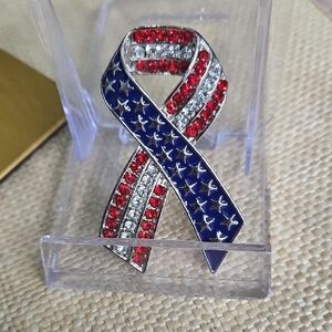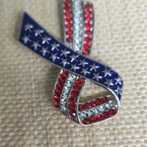 Elegant ribbon brooch adorned with red, white, and blue crystals. Perfect for patriotic events.