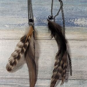 Long bohemian earrings with feathers and chain. Features black and brown feathers with silver accents.