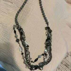 This stunning multi-chain necklace features elegant black and silver accents, perfect for adding a touch of sophistication to any outfit. Ideal for both casual and formal occasions.