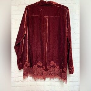 Luxurious velvet shirt with lace hem. Perfect for a stylish look. This is beautiful. It’s a rusty burgundy color. It’s a size Large. The bust is 44 inches and the length is 30. Enjoy!