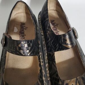 Alegria black and gold women's Mary Jane clog shoes with deck of cards pattern, size 41.