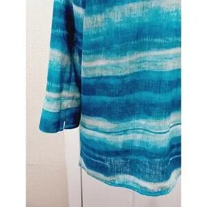 This is an Allison Daley women's blouse in size 10. It features a blue wave print on a multicolor striped pattern with a collared neckline and 3/4 sleeves. The blouse has a relaxed fit with a button-up style. It has casual sleeves and is designed for all seasons, with easy-care features. 21-in pit to pit and 26-in length.
