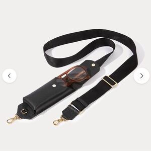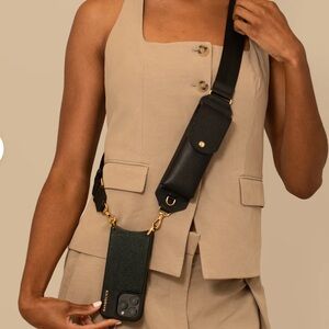 Sleek black phone case with adjustable strap. Gold hardware adds elegance. Perfect for hands-free convenience.