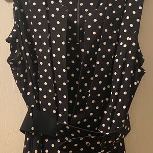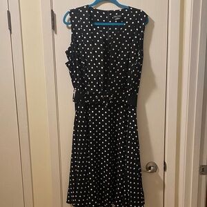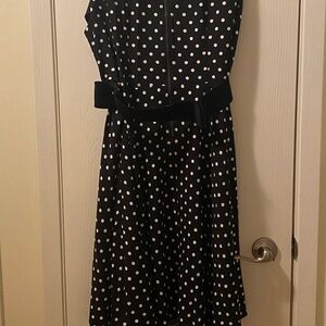 Stylish midi dress with polka dot pattern. Features a flattering fit. Also a perfect Halloween costume! Dress worn once- suggested for Lucille Ball or Audrey Hepburn style costume. Accessories include headband, scarf, glasses, (no lenses), and all pictured jewelry. Size L 20. Elastic belt included.