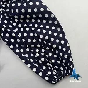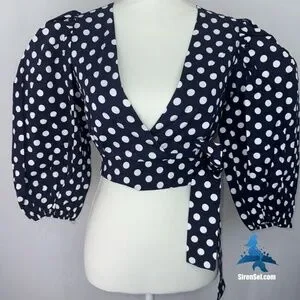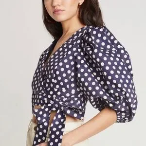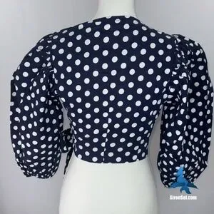 This Choosy Infinity Wrap Top combines playful retro styling with a dramatic modern silhouette. Featuring voluminous puff sleeves and a deep V-neckline, it cinches at the waist with an adjustable wrap tie for a customizable fit. The navy base with crisp white polka dots channels timeless charm, while the cropped hemline keeps the look fresh and versatile. Perfect with high-waisted trousers for a chic evening ensemble or paired with denim for a casual day out, this standout top is both statement-making and easy to style.