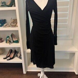 Chic and flattering, this black dress is a wardrobe must-have! Featuring a deep V-neckline, figure-hugging wrap silhouette, and elegant sheer long sleeves for just the right touch of allure. Midi length keeps it versatile - perfect for cocktail parties, date nights, or an elevated everyday look.