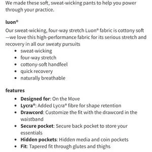 Our sweat-wicking, four-way stretch Luon® fabric is cottony soft—we love this high-performance fabric for its serious stretch and recovery in all our sweaty pursuits
