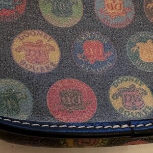 Stylish wristlet with vibrant logo pattern. Features secure snap closure and detachable strap.