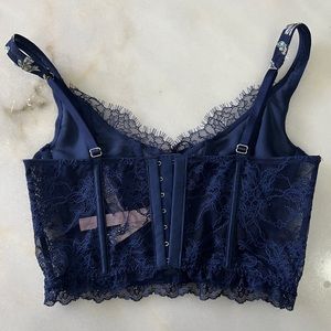 This romantic bustier in sheer mesh and multicolored floral lace features corset-style detailing at the front, plus boning throughout for shape and structure — wear it in or out.
