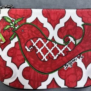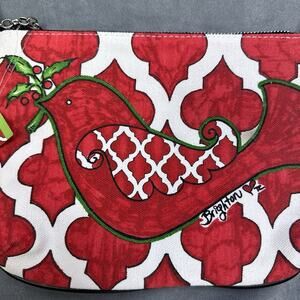 Listed is a Brighton Love Dove Pouch, new with tags. 10.5" w, 7.5" h, 1" deep according to tag. Canvas fabric with a PU coating to ensure durability. Wear it cross-body for holiday shopping ease. Carry the spirit of the holidays wherever you go. Zip top with zipper pocket inside. MSRP $70.