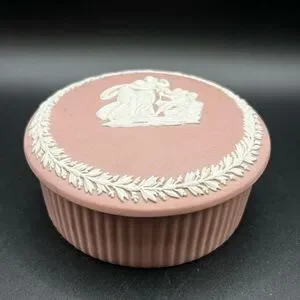Vintage Wedgwood England Pink Jasperware Trinket Box. Keepsake box, storage box, jewelry box. Greco Roman women and angel motif to the lid with ribbed sides.