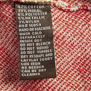 Smooth knit medium weight sweater with red, gray/cream and gold with metallic threads in its retro 60's inspired pattern.