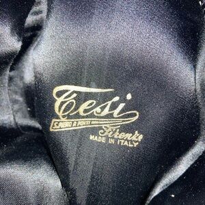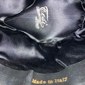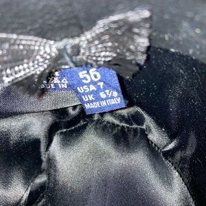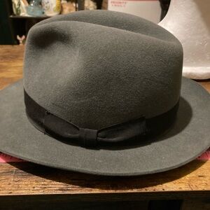 Tesi Fur felt fedora made in Italy. It is dark grey with black band and satin lining. It is a size 56 size 7. Looks to be in great shape. Some women like to wear men's fedora hats.