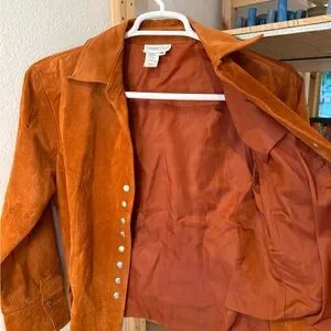 Stylish suede blazer in vibrant orange. Features elegant button detailing. Perfect for versatile wear.