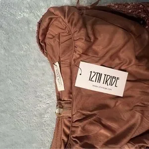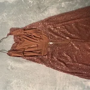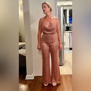 Dazzle in this rose gold sequin jumpsuit. Features a flattering cowl neckline. Perfect for glamorous occasions. Never worn, new with tags.