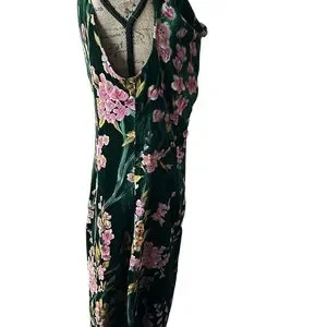 This stunning floral midi dress features a vibrant green base with beautiful pink blossoms. Perfect for any occasion, it offers a blend of elegance and style.