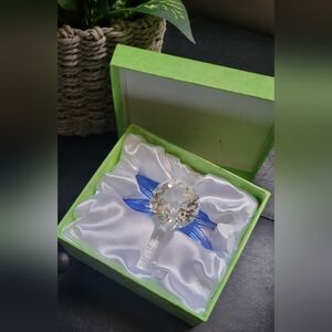Oleg Cassini Blue Crystal Dragonfly Figurine. This exquisite piece features stunning blue and clear crystal, adding elegance to any space.