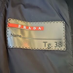 Sophisticated Prada coat in black. Features luxurious fur accents. Crafted from nylon blend.