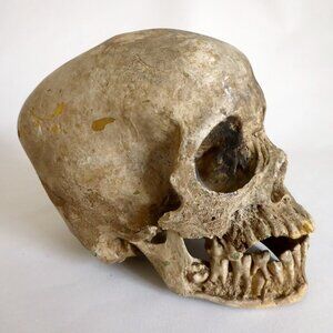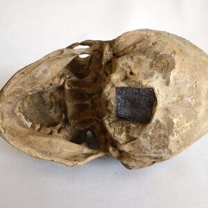 This movie prop skull looks to have been one of the skulls used in the scene where Captain Jack Sparrow is sitting on the tribes' throne that is covered and surrounded by human skulls. ( see photo capture).
