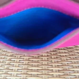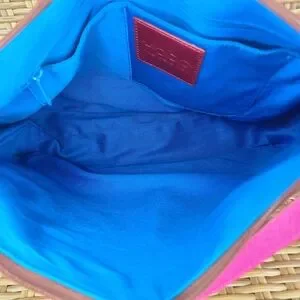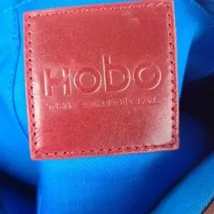 Hobo International shoulder bag, purse. Pink saffiano leather with blue fabric lining. Four silver toned protective feet on the bottom of the bag. Silver toned hardware. Main compartment has zipper closure with one inner zip pocket, and two slip pockets. There is one exterior slip pocket for your phone.