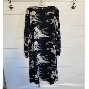 Wrap‑style midi dress with long sleeves, tie‑waist sash, and V‑neckline. Tropical island heat pattern. Swimwear beach coverup dress.