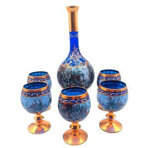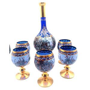 Murano Cobalt Blue Gold Pedestal Italian Victorian Scenes Decanter Wine Glasses