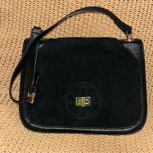 Tory Burch Gloria shoulder bag. Black Suede and leather turn lock bag. Adjustable strap. Retails $495. Great used condition. Some wear on hardware. Clean interior and side pockets. This elegant black leather handbag is perfect for any occasion.