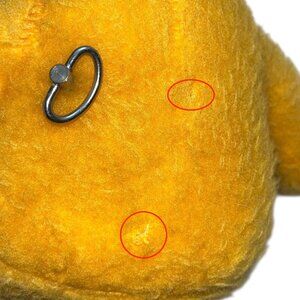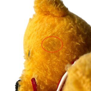 Several spots of wear from age throughout including some small holes in the back, ripping in bib, stretching of stitching, some discoloration on the cheek, some matting throughout.