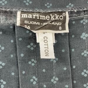 Marimekko 8 Mila Dress Muija Print Vintage 1970s Charcoal Gray Midi Scandinavian. Square neckline. Pleated. Flared 3/4 length sleeve. Geometric print. 100% cotton. In good pre-owned condition. Has a small white spot on sleeve. Please see measurements as sizing is vintage.