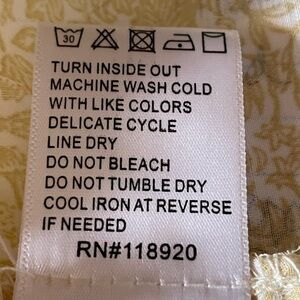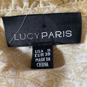 Short sleeve with elastic hem. Button closure in back. Smocked at waist to form peplum. Butter yellow and white