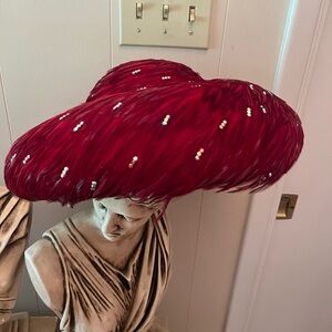 Add a touch of elegance to your outfit with this stunning red feathered hat. Perfect for special occasions, this accessory is adorned with delicate embellishments for a glamorous look.New never worn.. Designed by One of the best George Zamaul