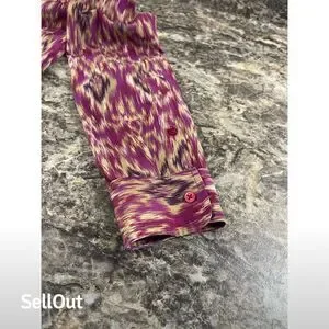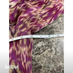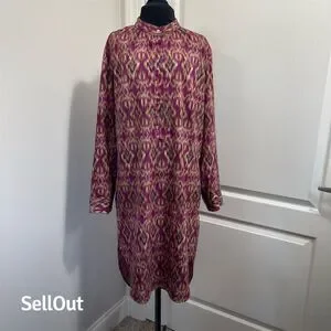 The Lauren Ralph Lauren tunic dress in M size is designed for women and features a vibrant purple Aztec/Ikat pattern. Made from polyester, it offers a comfortable pullover design with a button-up neckline and long sleeves. The dress includes two side pockets and is machine washable for easy care. Suitable for casual occasions, it can be worn for relaxed outings or informal gatherings. The dress is pre-owned.