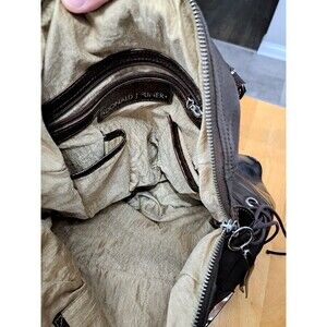 Donald J Pliner brown purse with zip closure on main compartment and a kisslock closure on the large front pocket. Double handles and gold color fabric lining with a crinkle texture.