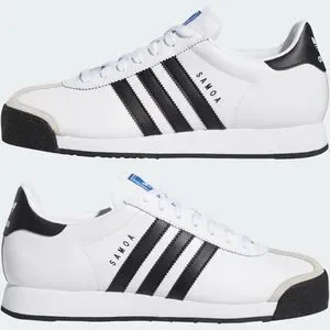 With a slim shape and sleek feel, the Samoa is a casual streetwear classic. These shoes have a leather upper with contrast 3-Stripes and a Trefoil logo on the tongue. The rubber toe bumper is a Samoa signature. Everything rides on an EVA midsole for all-day comfort.