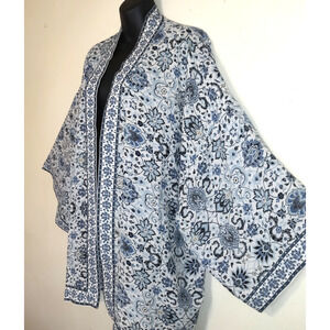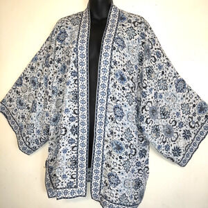 Previously Owned Blue and White Kimono. Open Front. 3/4 sleeves. Side bottom slits. Pretty edge trim.