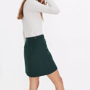 Madewell Assembly A-line Mini Skirt in vivid forest, size 4. Made of luxe Italian fabric, this A-line mini skirt does the effortless-meets-polished thing so well (and, no worries, the full lining means it's itch-free). So classic you'll wear it for years to come. Dark green wool blend skirt is lined and features front and back pockets and a back zipper with a hook and eye closure. Reviews say it runs large. Skirt is in excellent pre-owned condition.
