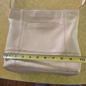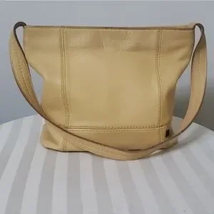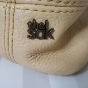 Stylish SAK pebble leather shoulder bag in creamy 'butter' and tone. Zipper closure. Perfect for daily use. Comfortable strap and spacious interior. Very clean inside, all pockets and zippers in good shape. A couple of small blemishes on bottom corners, see photos for details. Not noticeable. Super handy bag. No pets, no smoking.