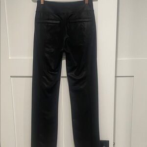 Sleek black straight leg pants with a split hem in front. The finish has a slight gleam to it and faux leather style. Designed for style and comfort. Worn only twice and in excellent condition.