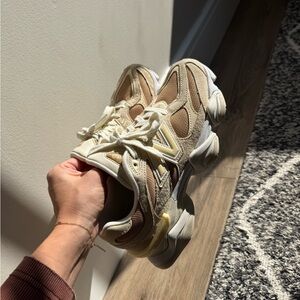 So comfortable and so on trend this colorway is the brown/ivory/cream combo it’s sold out cause it’s so good & perfect for all your fall looks! Worn twice they’re so comfortable but too big for me. In great condition !! Women’s 7 Men’s 5.5, grab these!