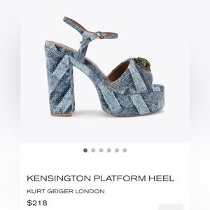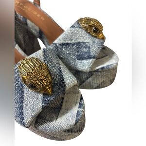 The Kensington Platform Sandal features a statement denim upper with bleached weave design and clear crystal embellishment. There is an antiqued brass eagle head with crystals sat on top of the toe strap.