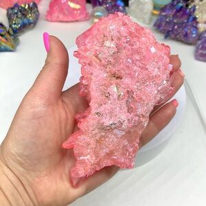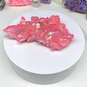 Enhance your space with this stunning pink crystal cluster. Its vibrant hue adds a touch of elegance to any room.