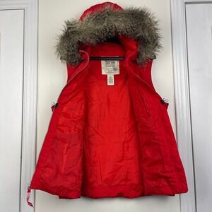 Eddie Bauer Womens L Down Faux Fur Hooded Puffer Vest Red White Trim Full Zip