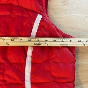 Keywords: Eddie Bauer, womens vest, down vest, puffer vest, hooded vest, sleeveless jacket, red vest, white trim, outdoor vest, casual vest, layered vest, winter vest, fall vest