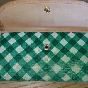 Green and white canvas exterior in plaid (gingham, checkered) print, tan leather features, and red fabric interior.