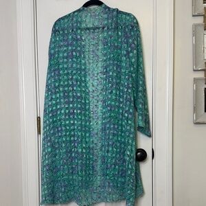 Beautiful vintage 1980s kimono-style duster in a lightweight, sheer fabric with an abstract green and purple pattern. Features an open front, wide sleeves, and a relaxed, flowy silhouette that drapes effortlessly to the knees. Perfect as a statement layering piece over dresses, swimsuits, or casual outfits. A timeless boho, coastal, or resort-ready look that blends comfort and vintage charm.