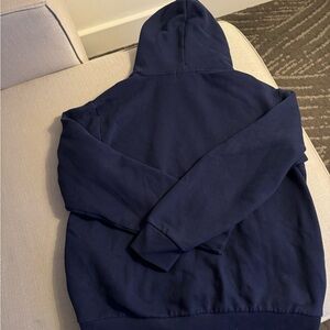 Classic dark blue hoodie with iconic embroidered logo. Comfortable and stylish for any occasion.