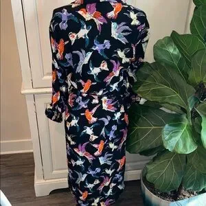Elegant black dress with vibrant bird patterns. Perfect for any occasion.